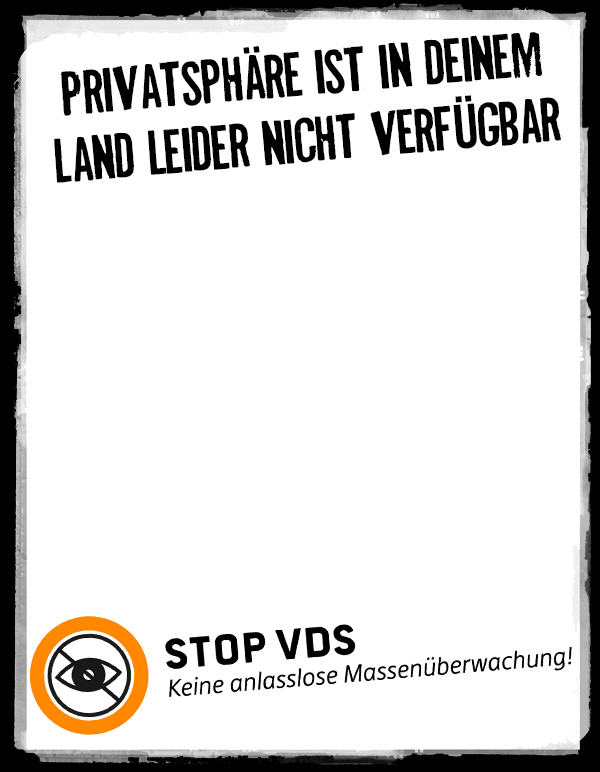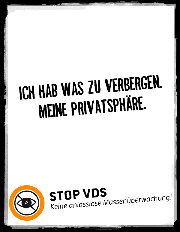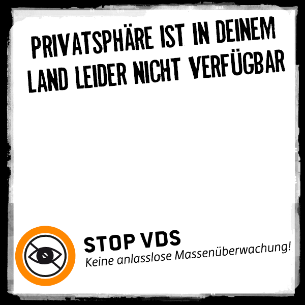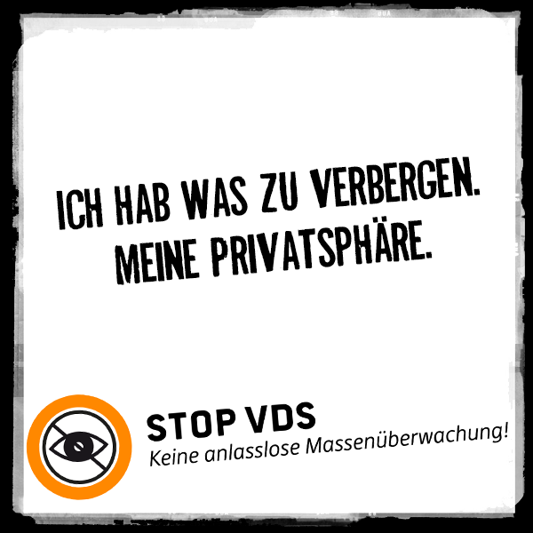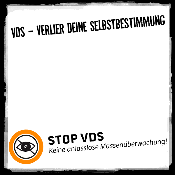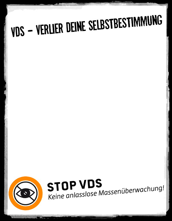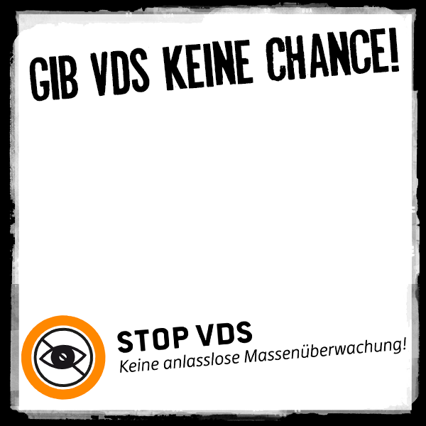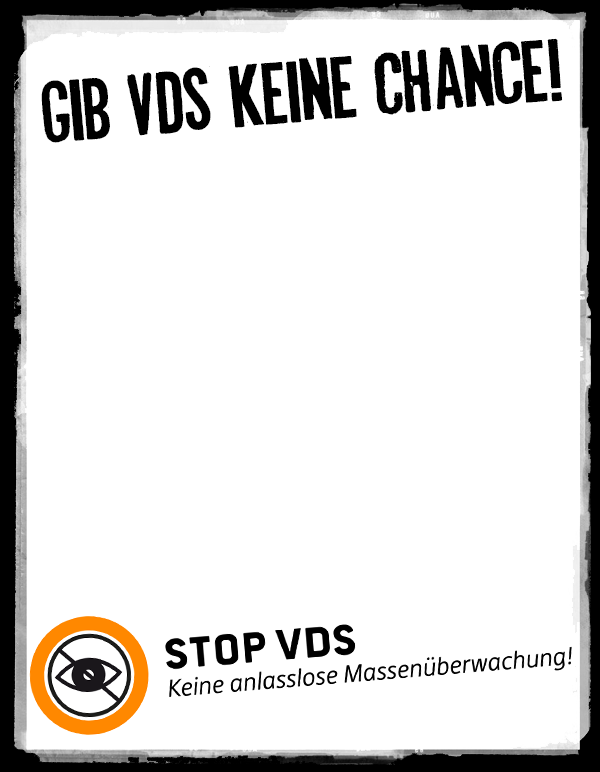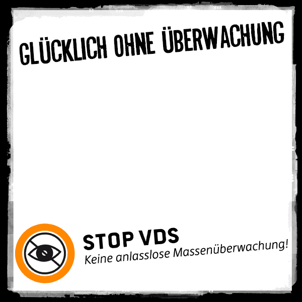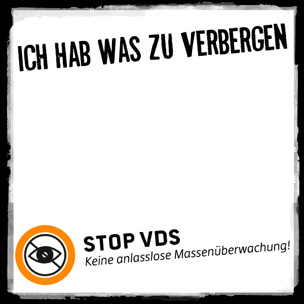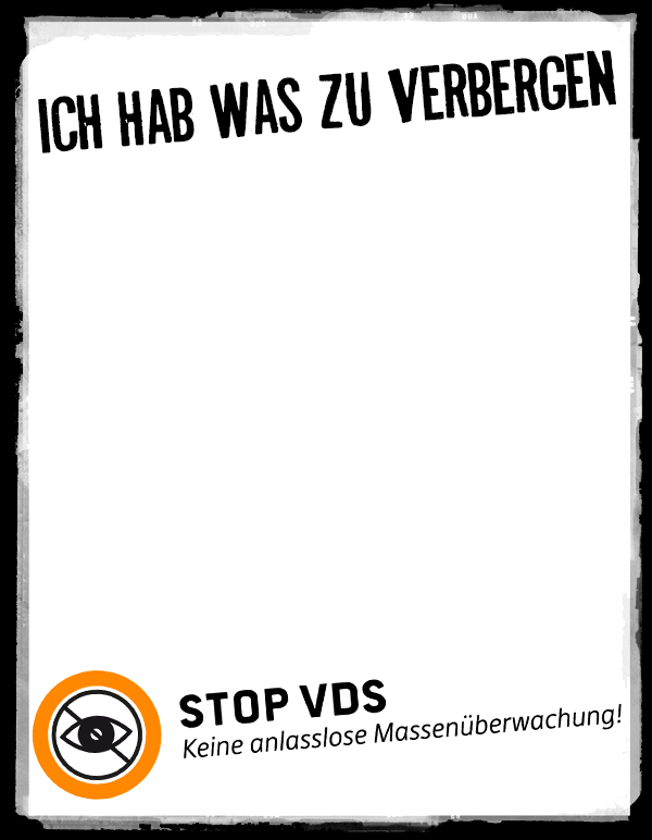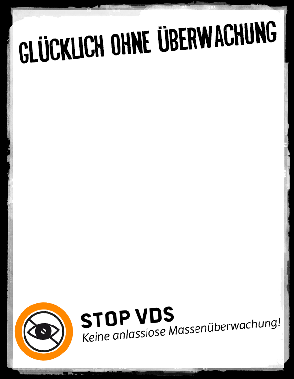 Bei der Aktion Gesicht zeigen gegen VDS kannst du mit deinem Gesicht und einem Slogan gegen die von der Bundesinnenministerin geplante verdachtslose IP-Vorratsdatenspeicherung protestieren, die jeden Klick im Netz nachverfolgbar machen würde. Das fertige Protestbild kannst du dann im Internet, in sozialen Netzwerken usw. mit anderen teilen und sie auf die Gefahren des Vorhabens hinweisen.