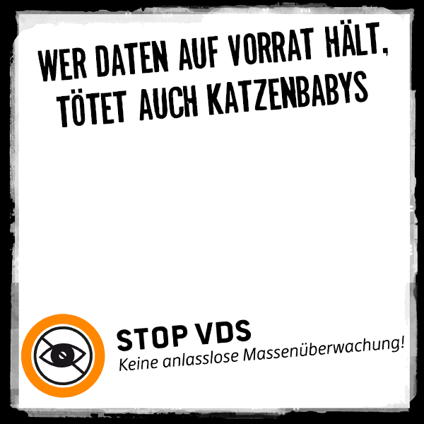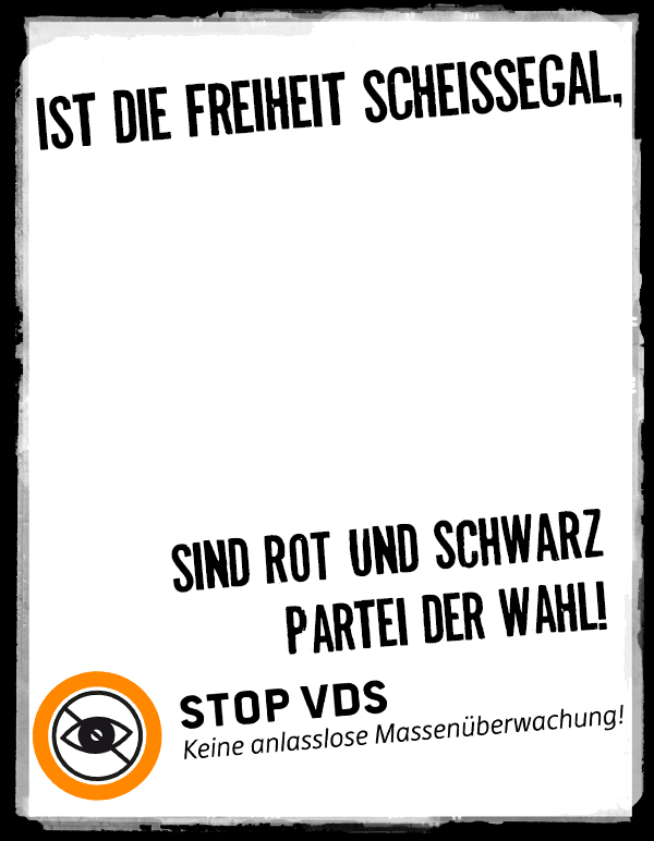 Bei der Aktion Gesicht zeigen gegen VDS kannst du mit deinem Gesicht und einem Slogan gegen die geplante Vorratsdatenspeicherung protestieren. Das fertige Protestbild kannst du dann im Internet, in sozialen Netzwerken usw. mit anderen teilen und sie auf die Gefahren des Vorhabens hinweisen.